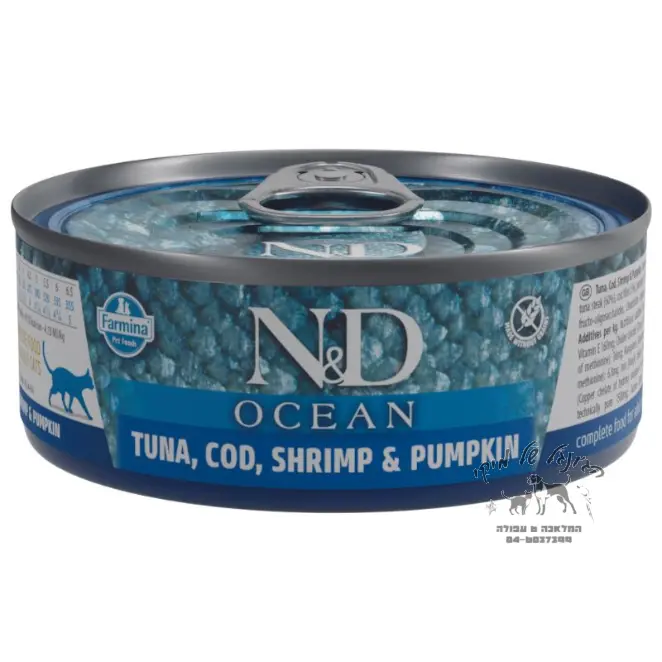 שימורי מזון מלא לחתולים בוגרים.סדרת שימורי אושן של N&D הוא ליין מוצרים המבוסס על 60% דגים ללא דגנים ובתוספת דלעת. מוצרי הסדרה מכילים רכיבים איכותיים וטבעיים, עשיר בנוגדי חמצון. הג'ונגל של מיקי עפולה