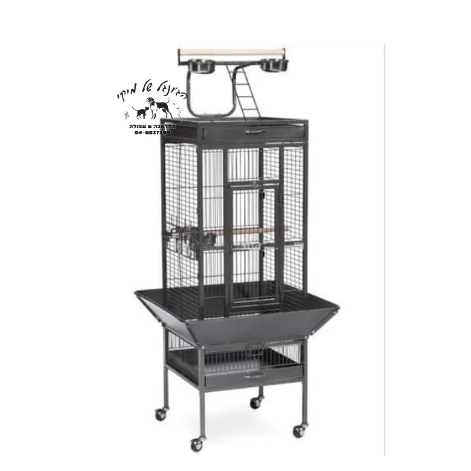 חלקו העליון הפתוח הכולל מקל עמידה מסיבי וכלי נירוסטה לאוכל ומים לשהייה מרובה מחוץ לכלוב.
