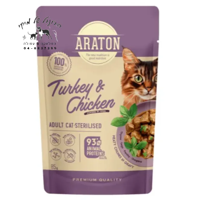 המרקם העסיסי והחלקים הרכים ברוטב הופכים את האוכל למושך אפילו לחתולים בררנים. עוף תרנגול הודו בוגר מעוקר ב-Araton אינו מכיל טעמים, צבעים או משפרי טעם מלאכותיים, והוא מתאים לשימוש כמנה עיקרית או בשילוב עם מזון יבש.