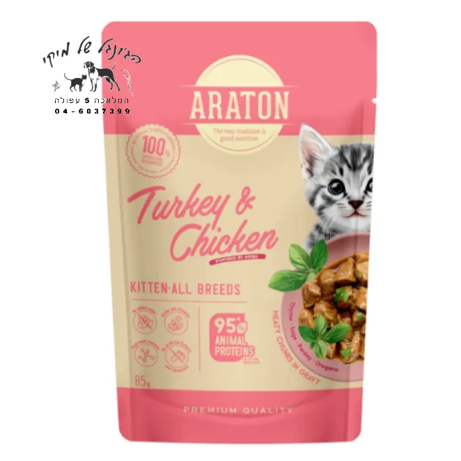 אראטון מזון רטוב מלא בפאוץ לחתלתולים עוף והודו ברוטב 85 גרם