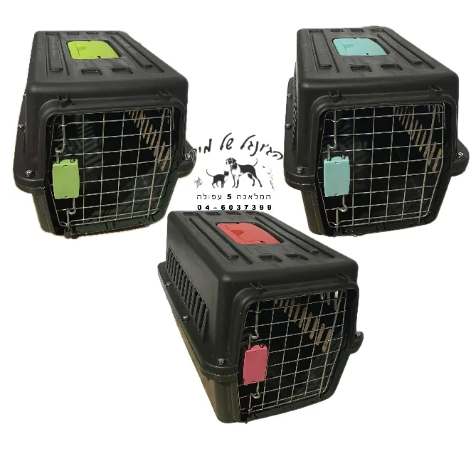 כלוב נשיאה מפלסטיק קשיח עבור חיות מחמד (חתולים או כלבים קטנים), המשמש להובלה בטוחה לווטרינר או בנסיעות, כולל דלת מתכת מאובטחת למניעת בריחה של חיית המחמד, בעל פתחים משולבים המבטיחים זרימת אוויר תקינה לחיה במהלך ההובלה.