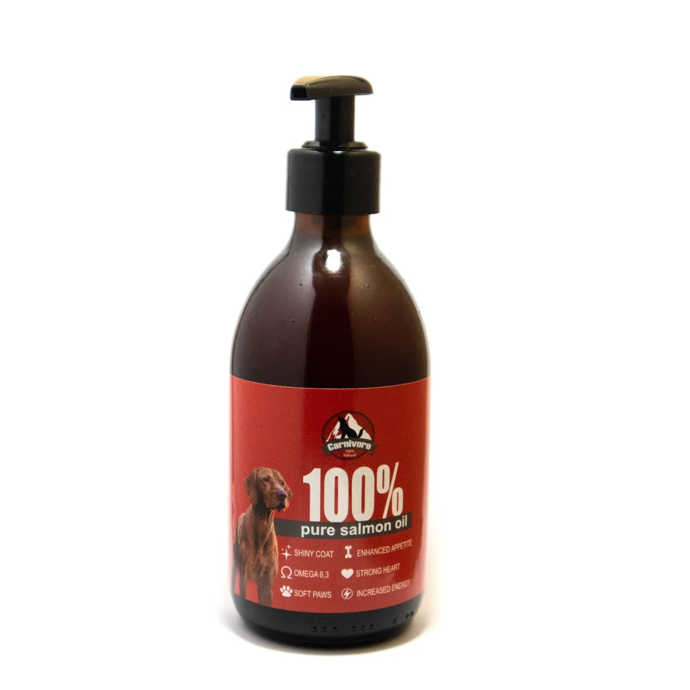 שמן סלמון טהור, מיוצר מדגי סלמון טריים ללא תוספים מלאכותיים. השמן נארז בואקום, בבקבוק אטום למניעת חדירת קרני שמש וחימצון. מומלץ לשלב בתזונה היומית על מנת לשפר את מראה הפרווה ומצב העור, לסייע בחיזוק תפקוד כלי הדם ומערכת העיכול. מומלץ גם לעידוד אכילה וכתוספת אנרגיה. ניתן להוסיף למזון או לתת ישירות לפה, בכל לחיצה נמזגים כ5 מ"ל שמן. מינון יומי מומלץ: לכלבים קטנים לחיצה אחת, לכלבים בינוניים 2 לחיצות, לכלבים גדולים 3 לחיצות. מרכיבים: שמן סלמון טהור.