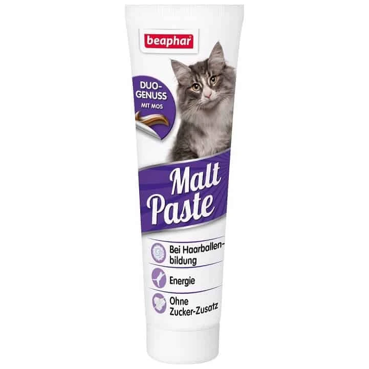 ביהפר משחה למניעת כדורי פרווה, Beaphar Malt Paste Cat. תוסף תזונה לחתולים. משחה המקדמת יציאה טבעית של כדורי פרווה ותומכת בתפקוד מיטבי של המעיים. בעלת פעולה כפולה: מכילה שמנים צמחיים המסייעים למעבר קל וחלק של הפרווה במערכת העיכול עד ליציאתה בצואה וגם מועשרת בתוסף bioMOS פרה-ביוטי המסייע להתפתחות בקטריות חיוביות ותפקוד תקין במערכת העיכול. בעלת מרקם וטעם האהובים על חתולים. משקל אריזה: 100 גרם.