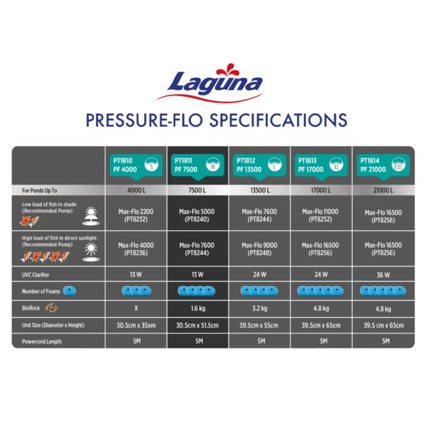 מסנן הבריכה UVC בלחץ Laguna Pressure-Flo מספק פונקציות סינון מים חשובות החיוניות לתחזוקה יומיומית של הבריכה: סינון מכני וביולוגי, כמו גם עיקור UVC הוא כולל מערכת ניקוי שטיפה לאחור קלה לניקוי מהפכנית המוגנת בפטנט שמנקה לחלוטין את כל פני השטח של מסנני הקצף, ועברה שיפורים משמעותיים כך שכעת היא אפילו קלה יותר לשימוש מבעבר.